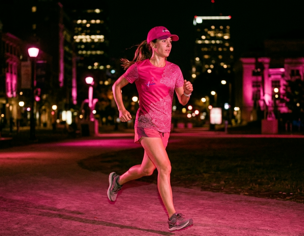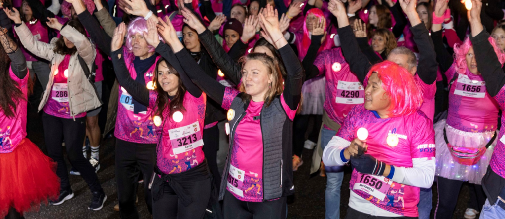La couleur rose, symbole du combat contre ce cancer est soulignée par des éléments réfléchissants et un bleu nuit qui se réfère à l’atmosphère de soirée unique de cette course nocturne.